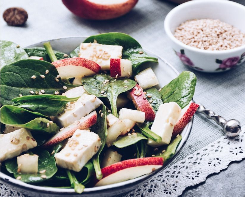 4.En un bol posa els espinacs crus, el préssec, el formatge i el sèsam. Amaneix i a gaudir.