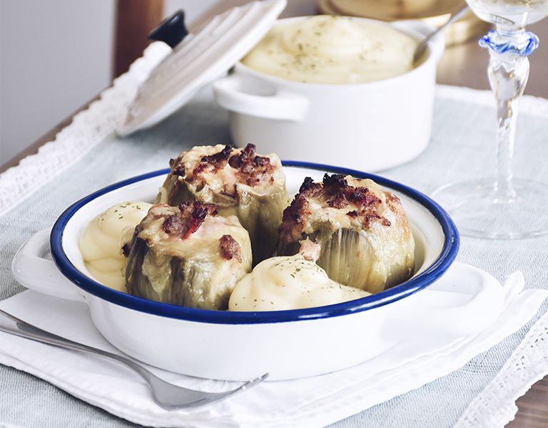 Alcachofas gratinadas rellenas de carne y jamón con puré de patata