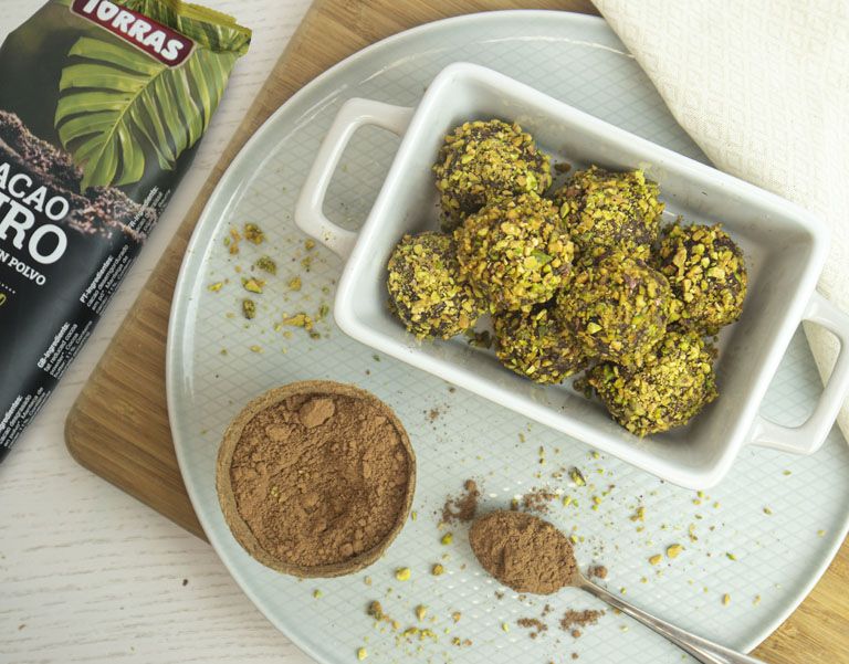 4. Pela y tritura los pistachos y reboza las bolitas con ellos.