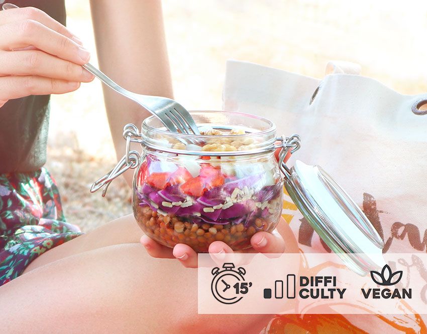 nuestra ensalada tiene vegetales crudos con muchas vitaminas y antioxidantes. Por ejemplo el pimiento rojo (al ponerlo en crudo) y la col lombarda contienen una cantidad importante de vitamina C, que nos ayuda a asimilar mejor el hierro de las lentejas. Al añadir frutos secos como las nueces, estamos enriqueciendo nuestra ensalada de legumbres ya que las nueces son altas en grasas saludables como el omega 3 y en minerales.