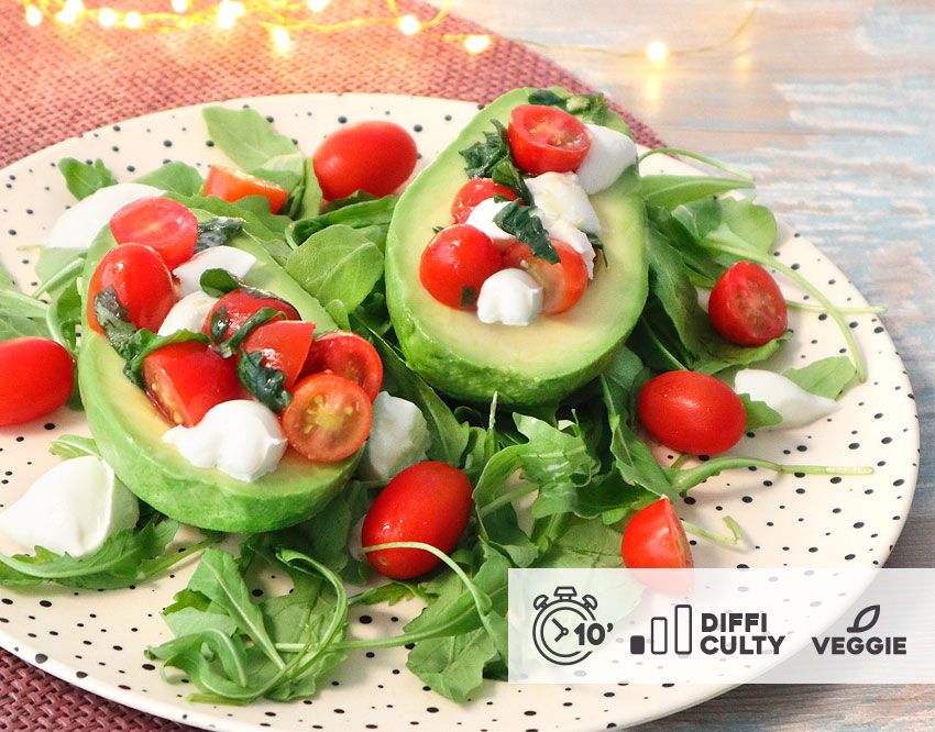 - Rellena las mitades de los aguacates con la ensalada caprese aliñada.
