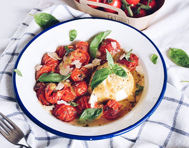 Pon en un plato para servir la bola de mozzarella escurrida, añade los tomates cherry horneados y acaba de aderezar con unas cucharaditas de pesto y unas virutas de queso grana padano.