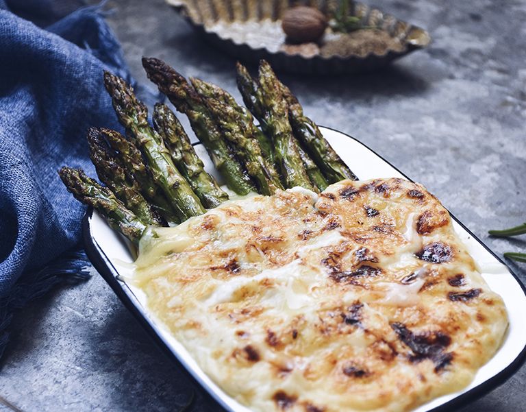 3. En una bandeja pequeña y apta por el horno pon los espárragos, añade la bechamel, el queso y un trocito de mantequilla.