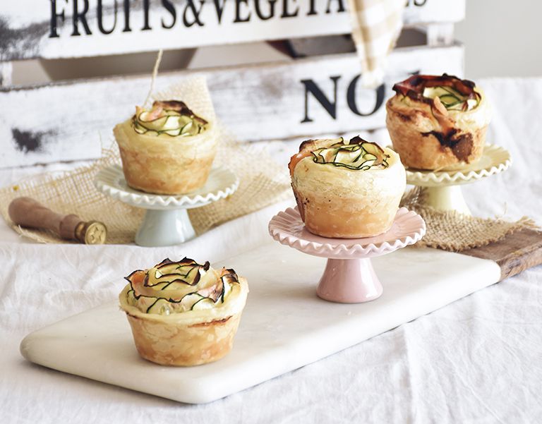 Coloca las rodajas finas de calabacín, a lo largo, en la parte que no has puesto crema, en la parte superior. De tal forma que sobresalga casi la mitad de la rodaja del calabacín y se monten un poco entre ellas. Coloca tiras de salmón sobre el calabacín, en la parte inferior de este, hasta cubrir el largo de la tira de hojaldre. Dobla la parte de hojaldre que lleva la crema hacia arriba, de tal forma que tape el salmón. Se queda en medio junto con la parte inferior del calabacín. Enrolla desde un extremo hasta el otro, de tal forma que quede como un espiral.