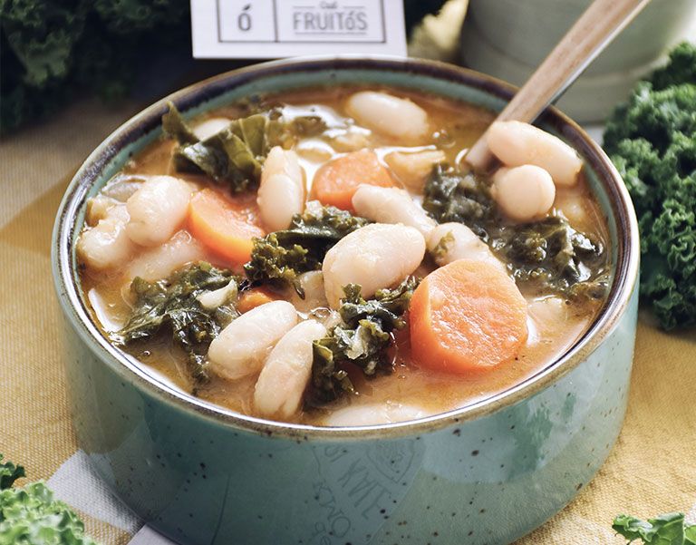 Añadimos las zanahorias cortadas y el tomillo. Dejamos hervir a fuego bajo unos 10’. Añadimos la kale sin el tallo y cortado a trocitos, dejamos hervir otros 5’ y finalmente añadimos las judías blancas. Mezclamos, dejamos cocer unos 5 ‘ más, todo junto y rectificamos de sal y pimienta.
