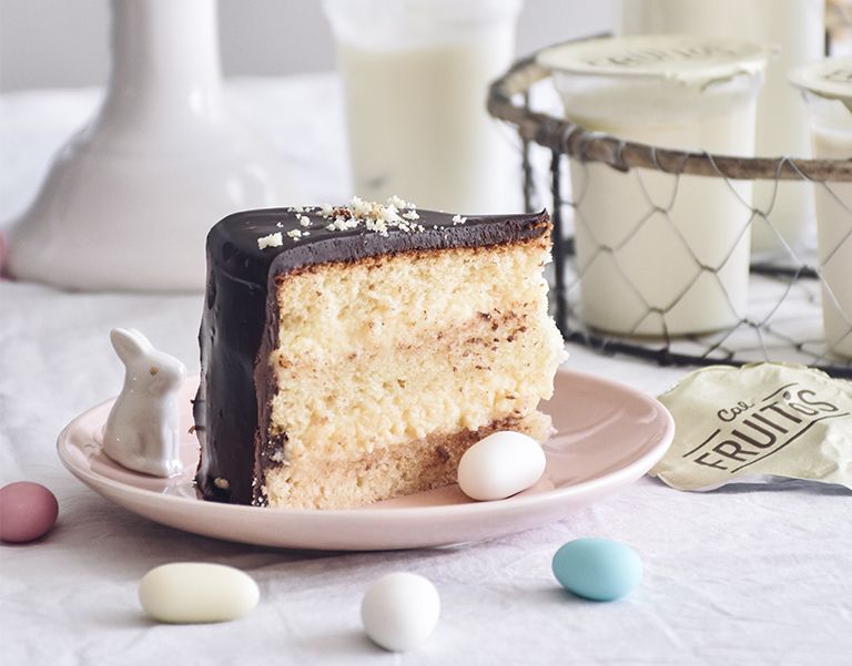 Sobre una base limpia y que puedas mover, pon una base de bizcocho, pon la mitad de la crema pastelera e iguala. Pon encima el otro disco de bizcocho y distribuye el resto de crema pastelera. Finalmente tapa con el último disco de bizcocho.