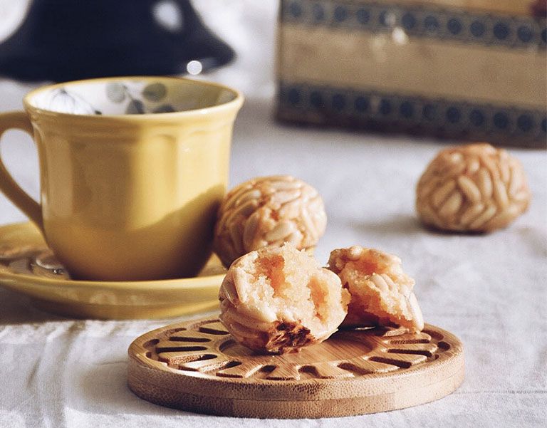 6. Hacemos bolitas con la masa base de la nevera y rebozamos con los piñones y con la almendra en grano, picada.