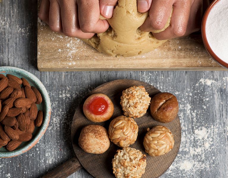 Pasa las bolitas por la clara de huevo y reboza con los frutos secos seleccionados. Ve poniendo las bolitas en la bandeja.