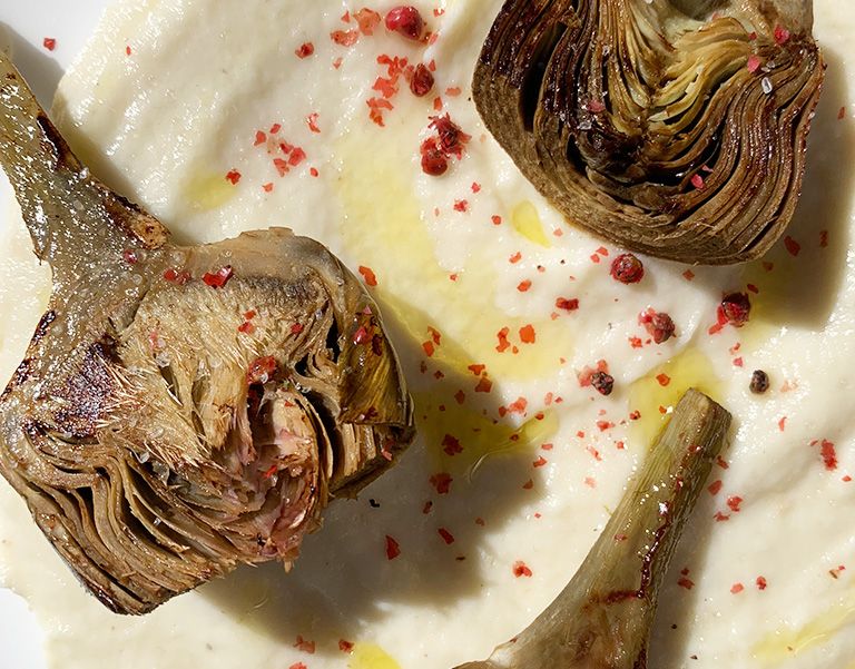 Para servir, coloca una capa de parmentier en la base del plato, pone las alcachofas encima y termina con un poco de aceite de oliva extra virgen y pimienta rosa para darle un toque final.