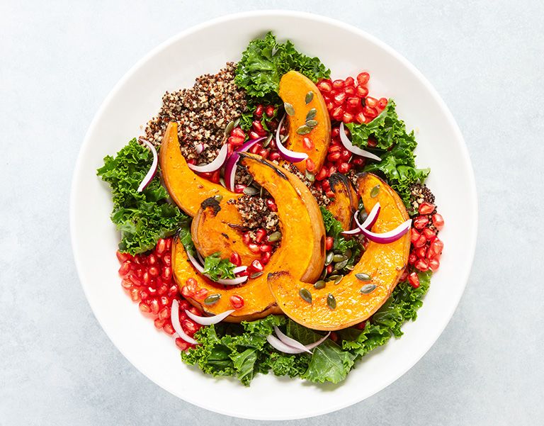 Sirve la ensalada tibia inmediatamente, aprovechando la temperatura de la calabaza asada y la kale escaldada.