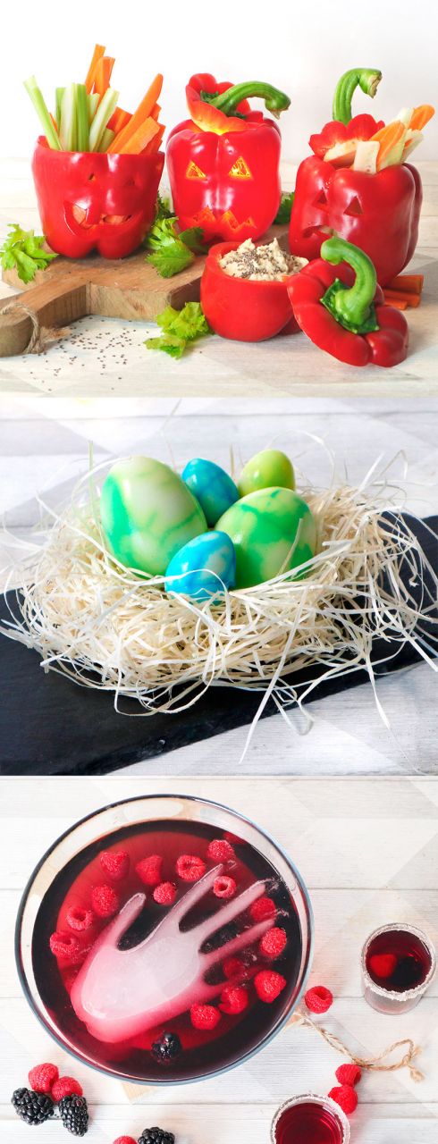Otro aperitivo super sencillo para Halloween a la vez que terrorífico puede hacerse con huevos duros. Para que queden como los nuestros, después de cocerlos y enfriarlos tendrás que dar suaves golpes en la cáscara para que se agriete. Después con un pincel y colorante alimentario, tendrás que pintarlos del color que prefieras. Cuando esté seco, al pelarlos verás el resultado!!