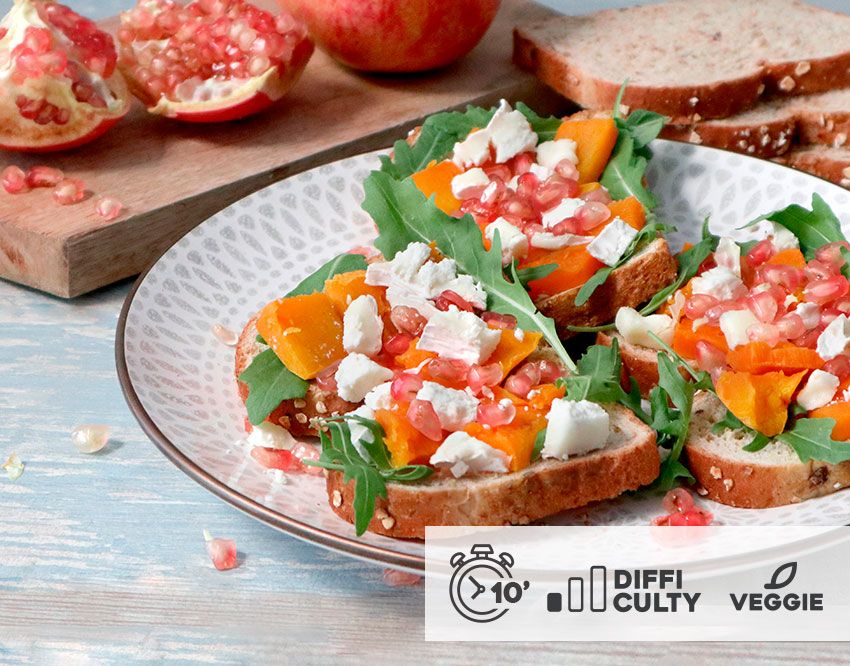 Esta receta es muy fácil y nos puede servir como desayuno o merienda. También puede ser un entrante perfecto para sorprender a tus invitados. Si tenemos niños en casa, hacer este tipo de tostadas nos ayudará a que se familiaricen con nuevas frutas y verduras, ya que podrán ayudarnos a hacerlas. Además aprovecharemos todas las propiedades saludables de la calabaza y la granada.