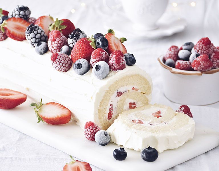 Dejamos sobre la bandeja que vamos a utilizar para servir el tronco de navidad y cubrimos con la nata y adornamos con los frutos rojos.
