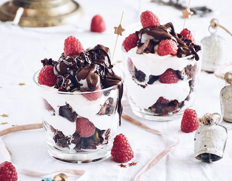 Estos vasitos de brownie con nata y frambuesas además de bonitos son una idea buenísima para postres esta Navidad. ¿Quieres saber como hacerlo?