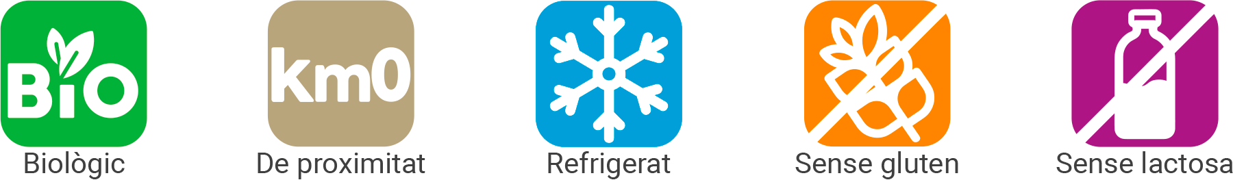 Addicionalment trobaràs les nostres icones de productes biològics, refrigerat, de proximitat, sense gluten I sense lactosa, per tal que puguis identificar d'una manera ràpida i senzilla productes amb aquestes característiques. A més, si ho prefereixes, pots comprar amb els filtres sense gluten, bio i sense lactosa.